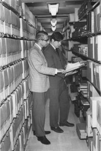 AIHP Executive Director Glenn Sonnedecker (left) confers with Wisconsin State Archivist F. Gerald Ham in 1970 during the establishment of the History of Pharmacy Archives Collection at the Wisconsin Historical Society.
