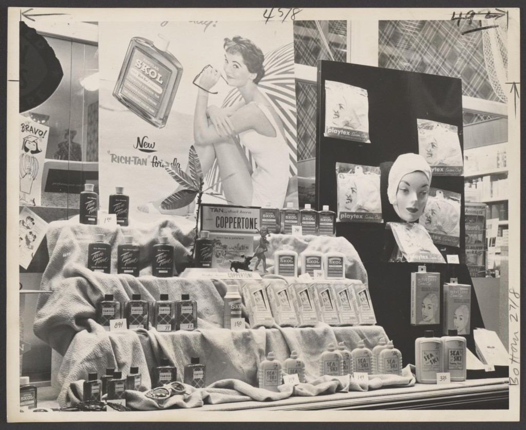 May 9, 1960: A window display in a pharmacy window promoting summer merchandise. The caption reads: “Summer window at McClord’s Pharmacy, San Mateo, Cal. ties in bathing caps with suntan preparations. Dummy head and mounted packages emphasize caps; large placard pushes lotion. Drape creates solid backdrop for staggered rows of suntan preparations.” Courtesy of American Institute of the History of Pharmacy Drug Topics Photograph Collection