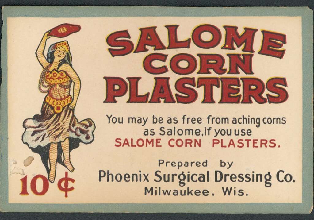 I have always loved the story of Salome and thought this was a pretty hilarious (and creative) application of her Dance of the Seven Veils to advertising. Though, as Fischelis Scholar Greg Higby pointed out, perhaps a Salome headache cure would have been more appropriate!