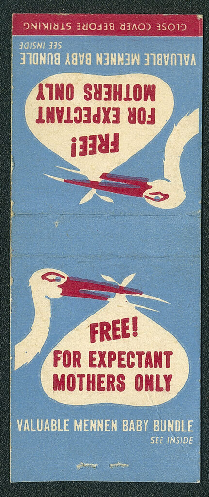 Even though I am not a phillumenist (a collector of matchbooks), one of my favorite matchbooks is from the Mennen Company, Newark, NJ. Illustrated with storks holding bundles for Expectant Mothers who can receive a free Baby Bundle if they fill out the order form on the inside cover before the offer expires on June 30, 1951.