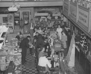 Manager handing out lollipops at Anderson Drug Store in Tracy, California. (Drug Topics Photograph Collection – Fountains, Soda, 1950)