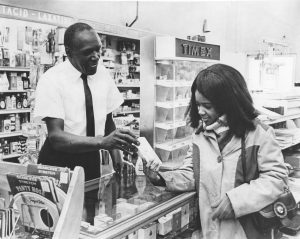 Pharmacist Ben Armstrong helping customer at Dox Pharmacy in Grand Rapids, Michigan. (Drug Topics Photograph Collection – Minorities)