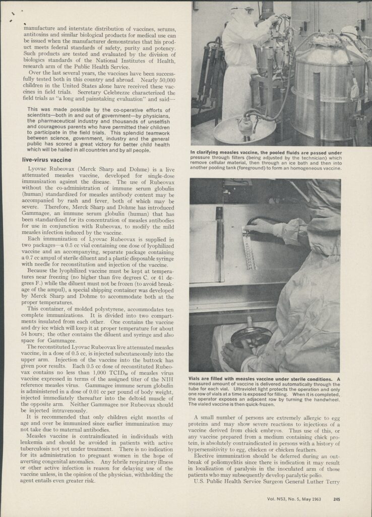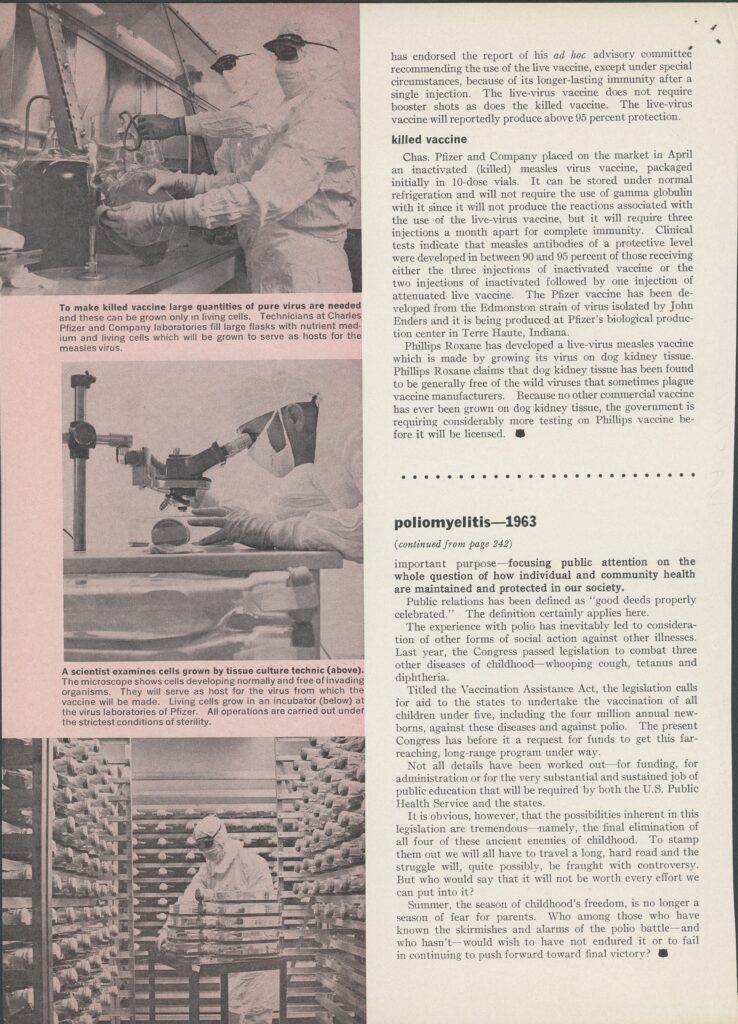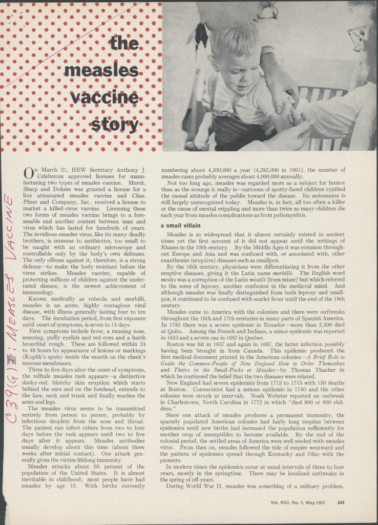 “The Measles Vaccine Story.” Article cut out, magazine name and author unknown. May, 1963. Accessed through the AIHP Edward Kremers Research Library and Archives.