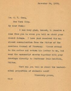 Despite the high degree of formality with which these letters were written, a deep regard and affection is nevertheless conveyed between the students and Kremers. Students discuss their current work, but they also share personal news such as marriages and the birth of children. Kremers responds with a great deal of interest in their work and personal milestones, and he often ends his letters by posing a question to prompt further scientific inquiry. In his reply to Chen, written on 24 November 1928, Kremers closes with: “What can you tell me about the bactericidal properties of shikimic acid?”