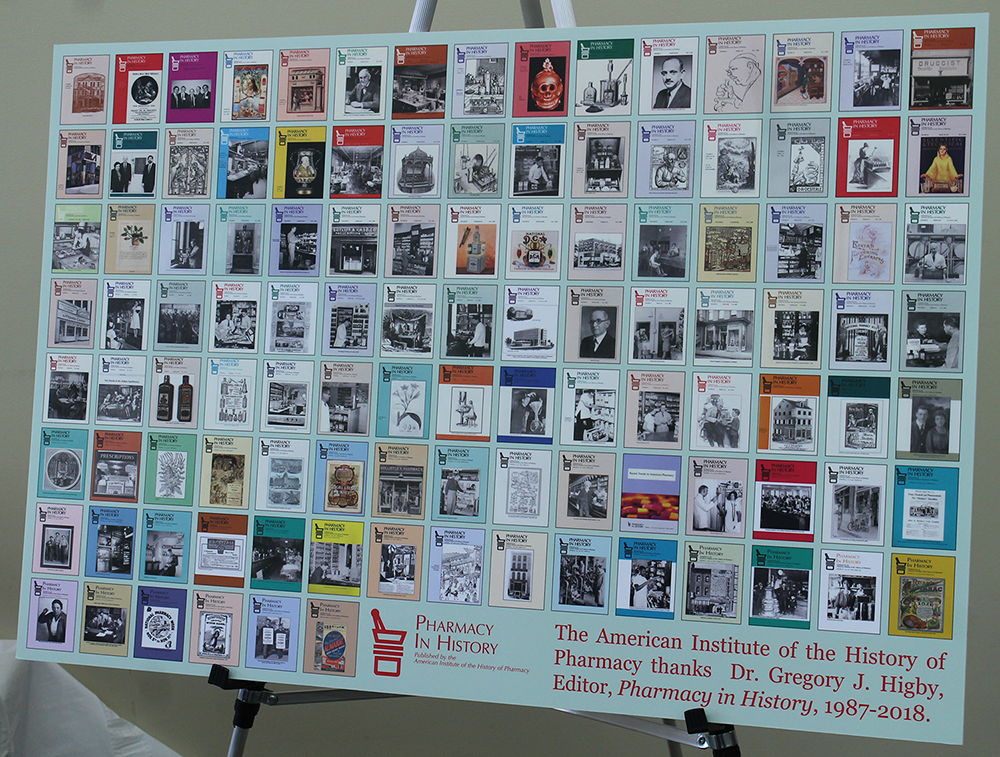 AIHP Administrative Director Dennis Birke, AIHP Assistant Director Greg Bond, and AIHP Curator Beth Fisher presented Dr. Higby with a poster containing cover images from the 111 editions of Pharmacy in History published during Higby’s tenure as the journal’s editor-in-chief. Another retirement gift—an iPad tablet—was presented on behalf of AIHP’s Board of Directors, AIHP’s staff, and members of the UW Pharmacy School’s faculty and staff.