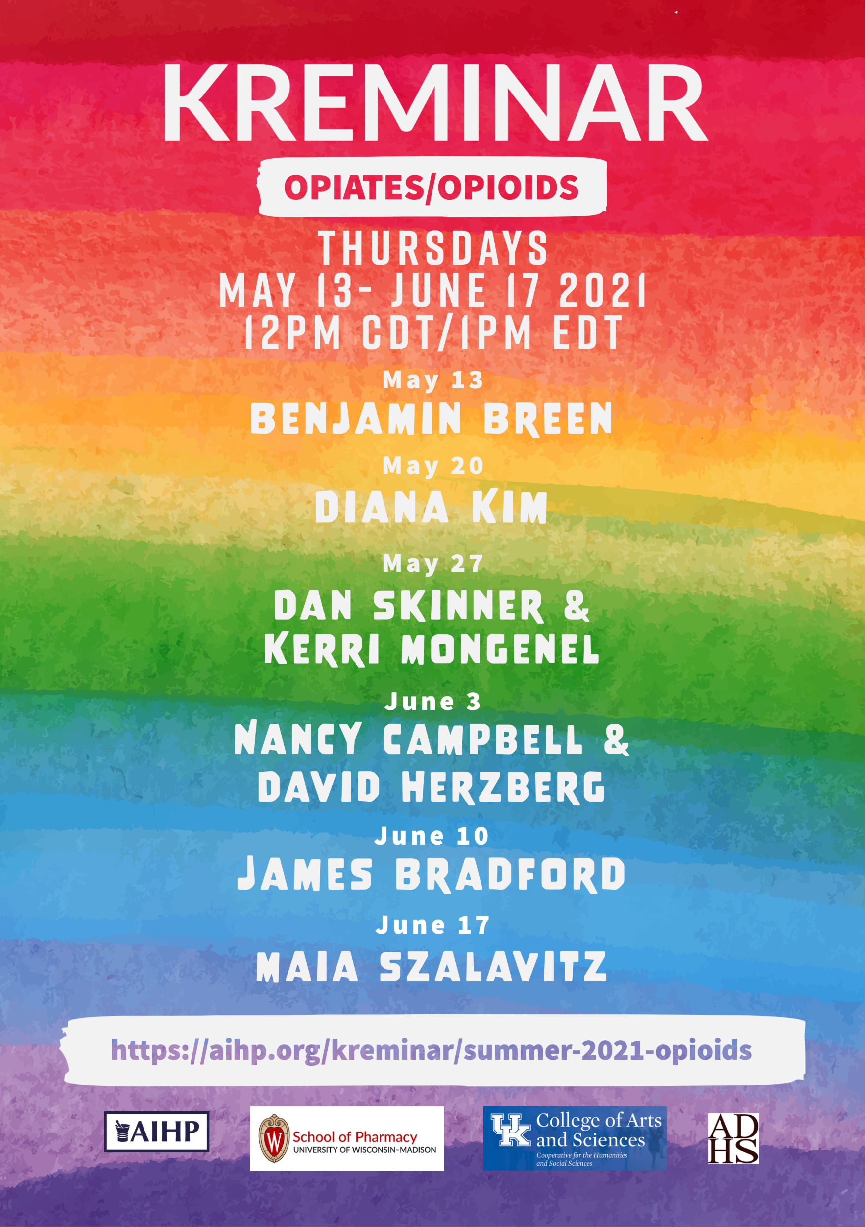 The the second annual Edward Kremers Seminar in the History of Pharmacy & Drugs took place in May and June of 2021. The Summer 2021 “Kreminar” explored the theme of Opiates & Opioids and featured six virtual seminars, presentations, and discussions by scholars and practitioners researching and writing about the history and the contemporary status of opiates, opioids, and addiction.