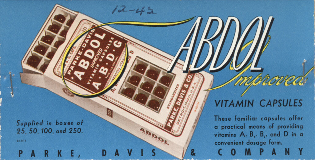 The Parke, Davis & Company Ink Blotter Collection comprises 236 ink blotters that the company produced in the 1930s and 1940s to advertise their pharmaceutical products. Measuring 7 by 3 ½ inches, they carry eye-catching visual images and pack a lot of information into a small space: the key ingredients in a drug or medicine, the health complaints it addressed, and recommended dosages. William Helfand, a noted collector of pharmacy-related ephemera and a longtime AIHP member, donated the ink blotter collection to AIHP.
